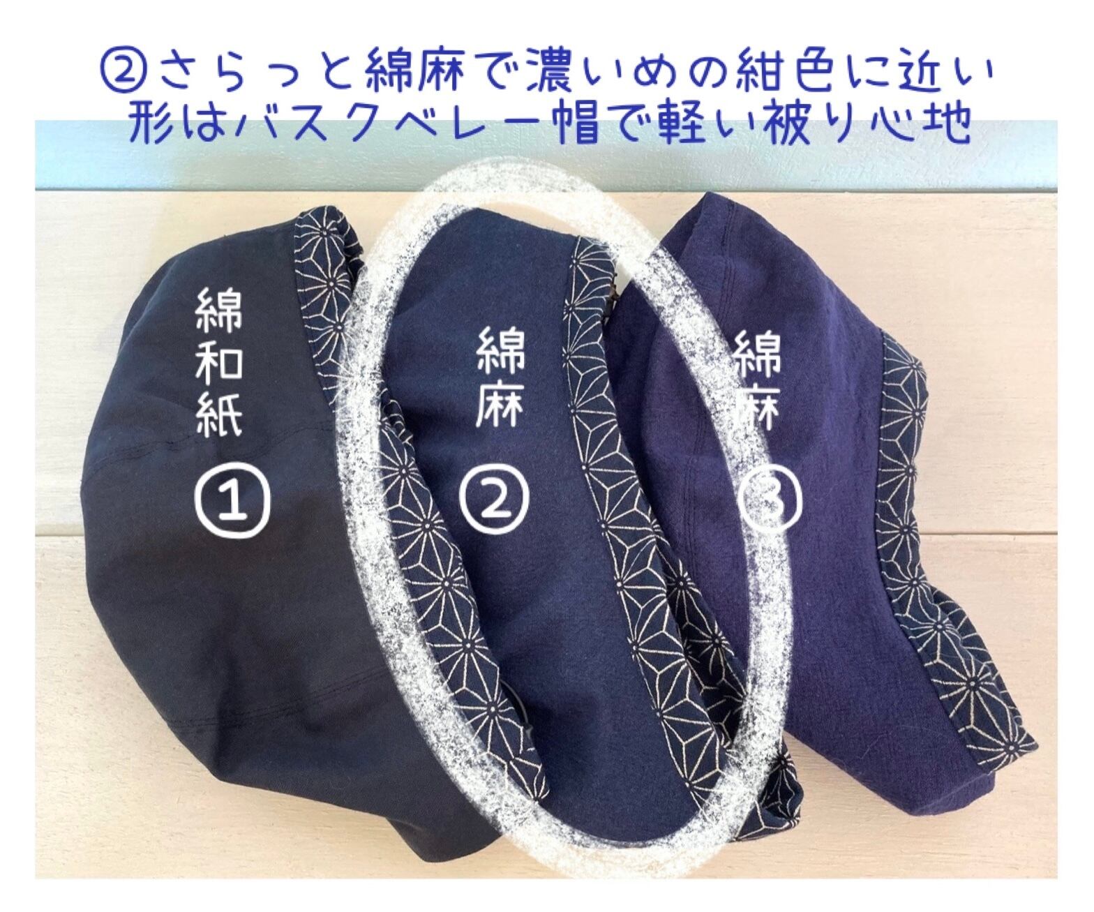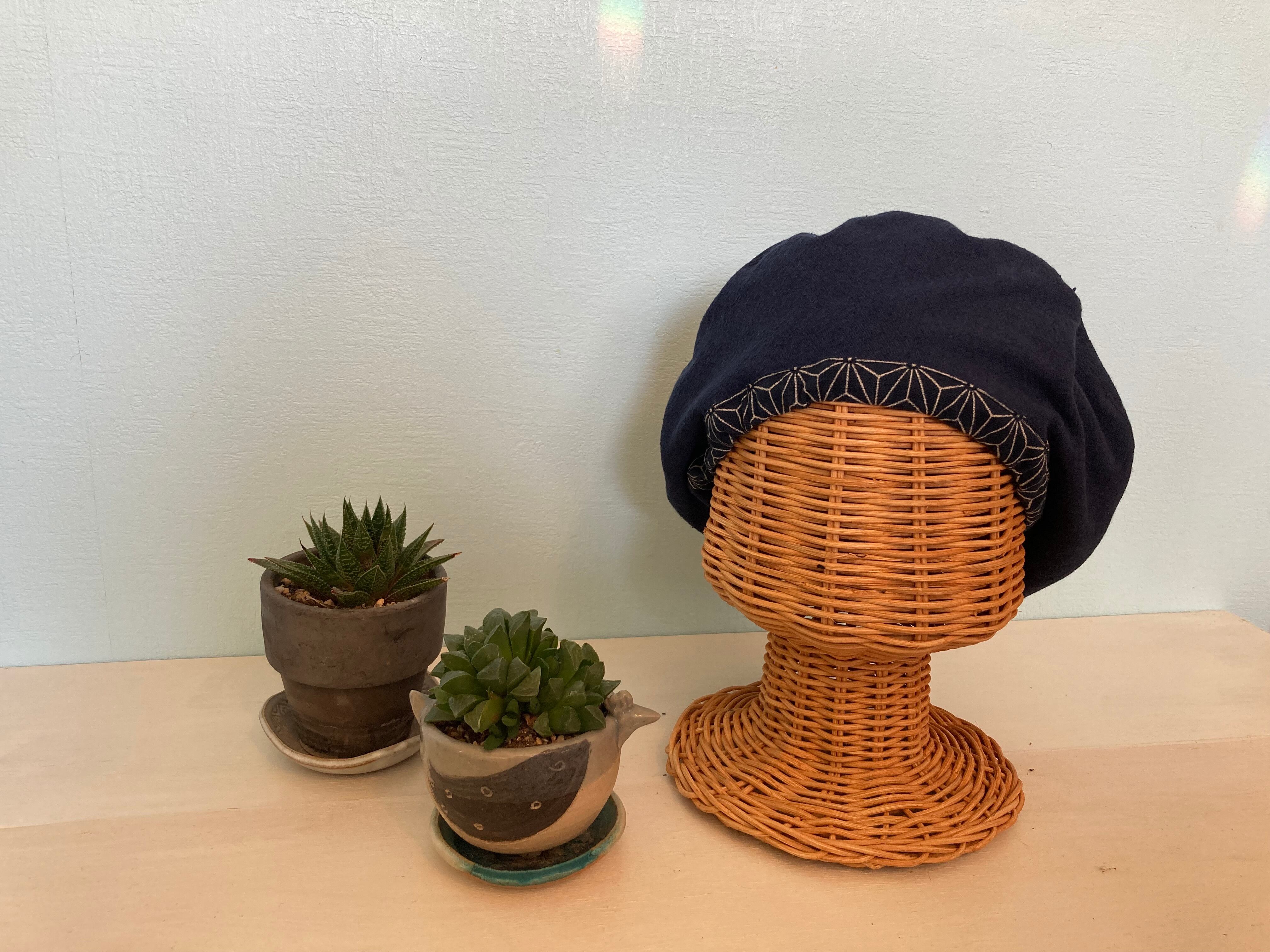 麻柄綿生地と綿麻紺色のバスクベレー帽を作りました。