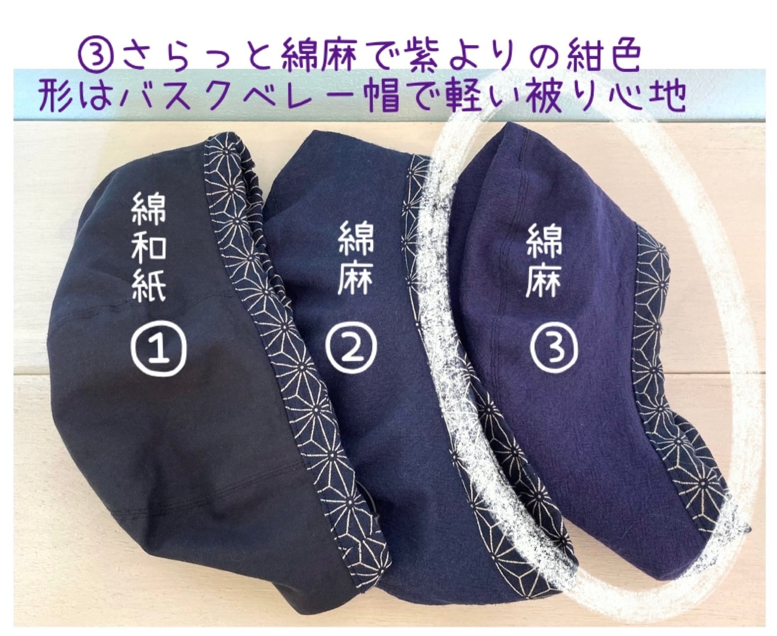 麻柄&綿麻の少し紫色が入った紺色のバスクベレー帽